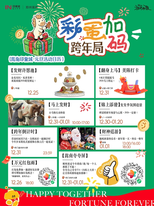 12月31日-1月3日,憑快樂幣可免費(fèi)騎小馬、抽獎(jiǎng)、兌換零食禮包,輕松實(shí)現(xiàn)童趣與味蕾雙重滿足。跨年夜,商場(chǎng)營(yíng)業(yè)時(shí)間延長(zhǎng)至23:00后自然閉店,大屏同步跨年倒計(jì)時(shí),和親友一起在歡呼聲中迎接2026,氛圍感直接拉滿!